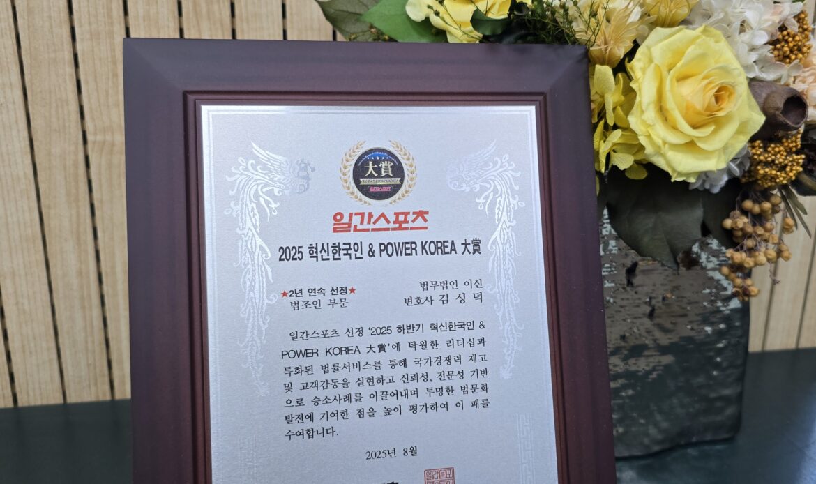 법무법인 이신 김성덕 대표변호사는 2년 연속 법조인 부문에서 탁월한 리더십과 특화된 법률서비스를 통해 국가경쟁력 제고 및 고객감동을 실현하고 신뢰성, 전문성 기반으로 승소사례를 이끌어내며 투명한 법문화 발전에 기여한 점을 높이 평가하여 일간스포츠 선정 2025 혁신한국인 & POWER KOREA 대상을 받았습니다.