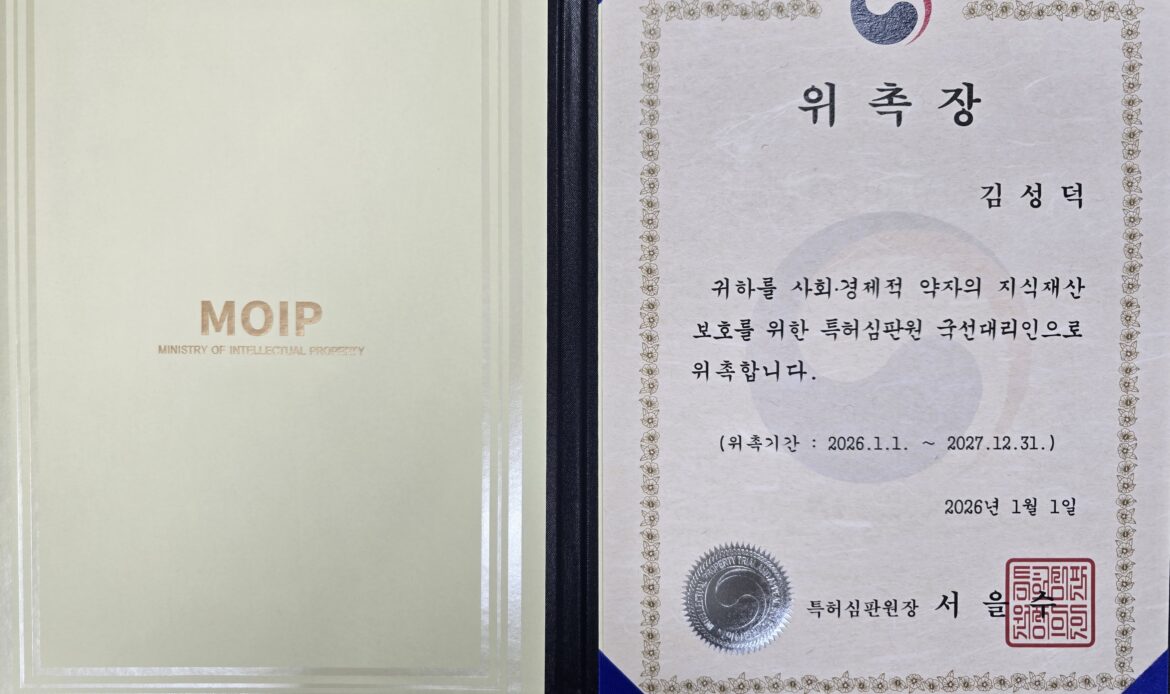 법무법인 이신 이신 소식 2026-01-23 법무법인 이신 김성덕 대표변호사는 2026년 1월 1일 지식재산처로부터 특허심판원 국선대리인으로 위촉받았습니다 위촉기간: 2026. 1. 1. ~ 2027. 12. 31. 중소벤처기업부 중소기업기술보호 법무지원단 위촉장